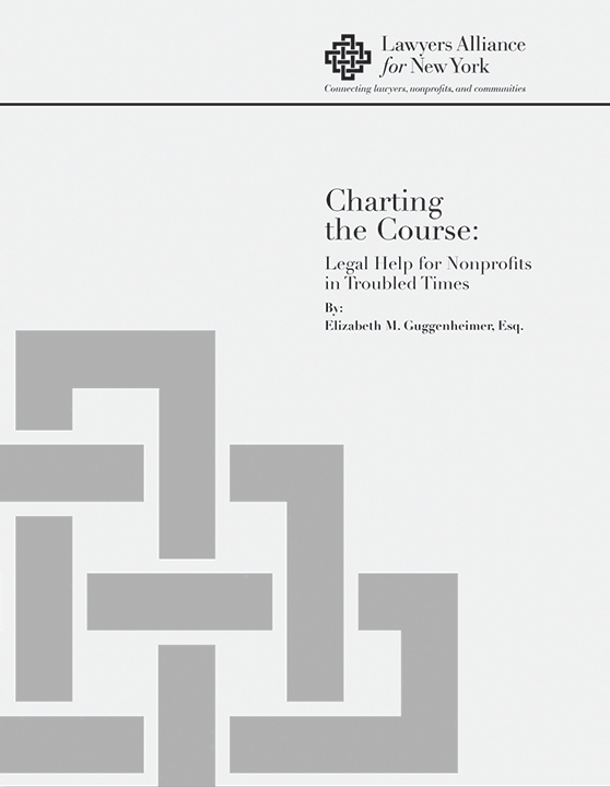 Thanks to the generosity of New York's philanthropic community, Lawyers Alliance is also making a free PDF copy of Charting the Course, including footnotes with website links, to nonprofit organizations facing financial difficulties that request a fee waiver. To request a copy for your nonprofit organization's limited internal use, send your and your organization's name, mail and email address, and phone number to publications@lawyersalliance.org with "Charting Fee Waiver Request" in the subject line. Do not use the buttons below.